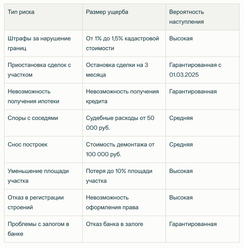 Отсутствие межевания создает серьезные риски для собственников земельных участков. Наиболее значимые из них связаны с административными штрафами и ограничениями в распоряжении имуществом.